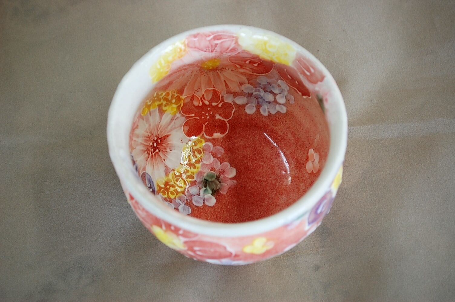 ゆずりは工房の紅彩間取福々碗平型は、自然の美しさをイメージした華やかな紅色の